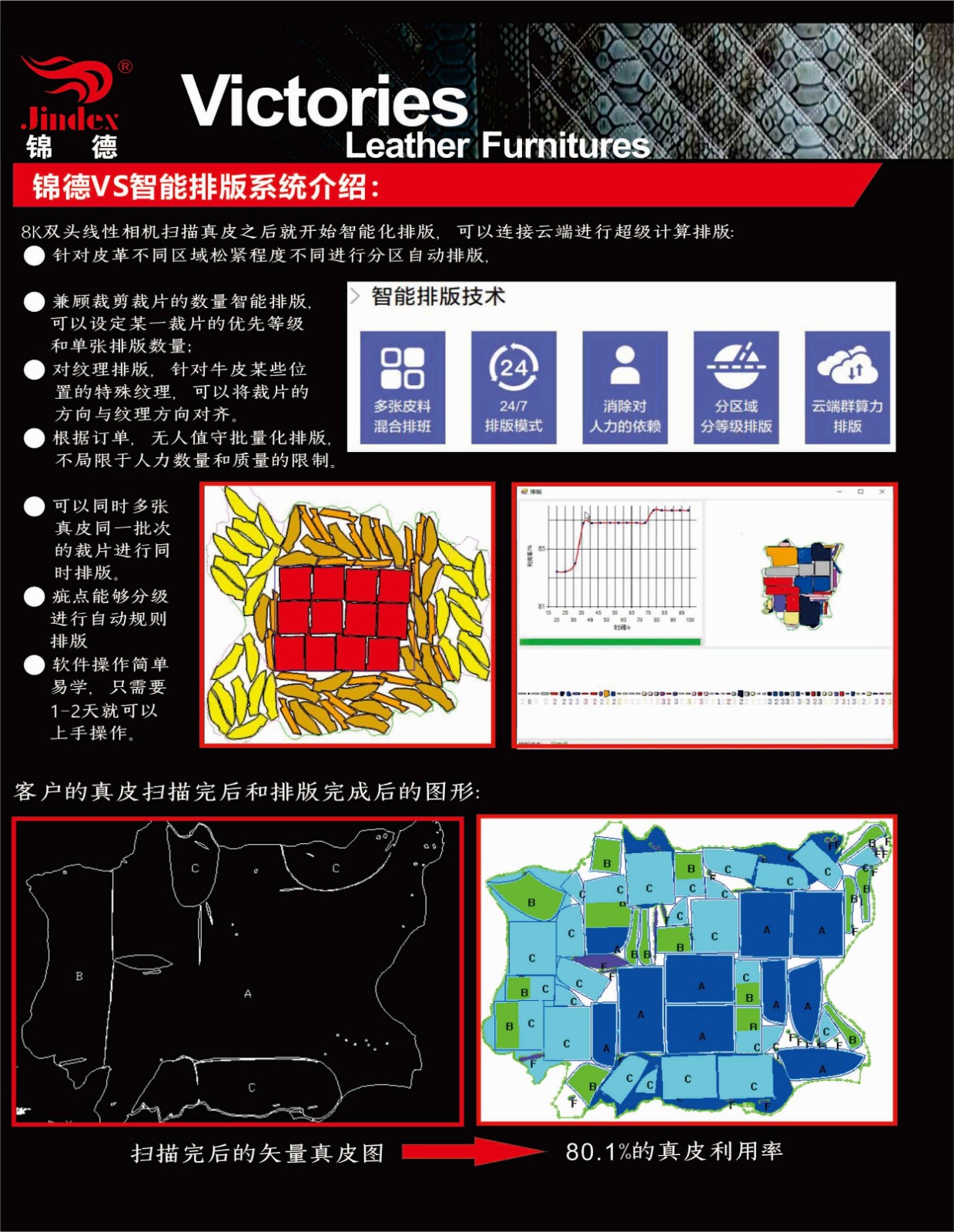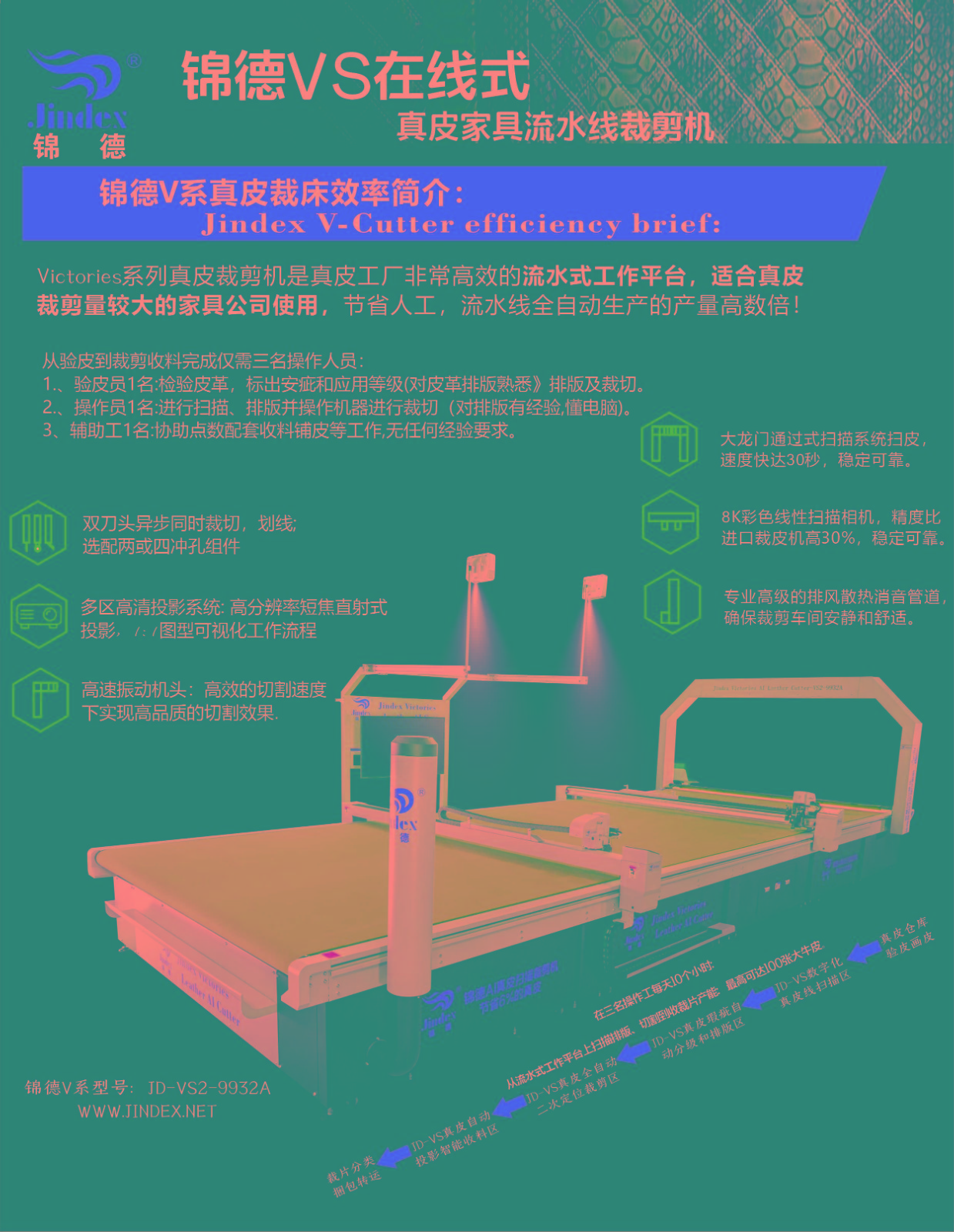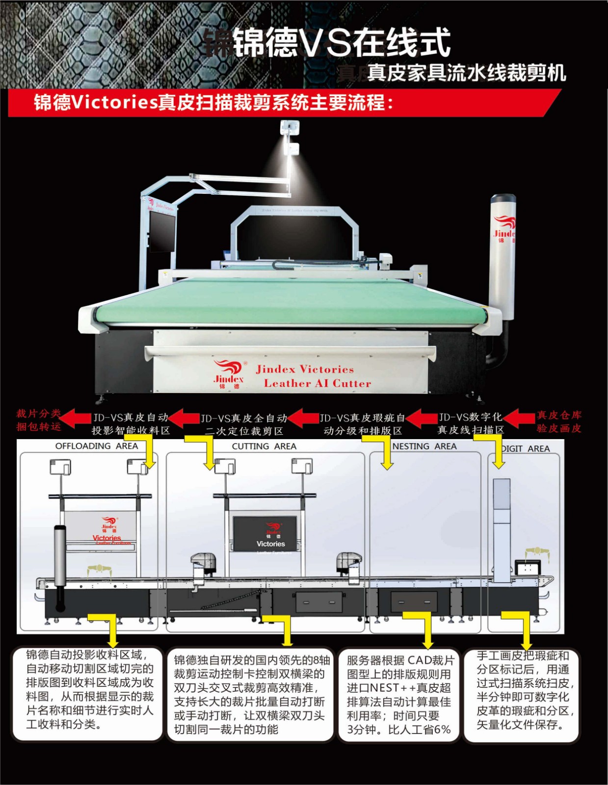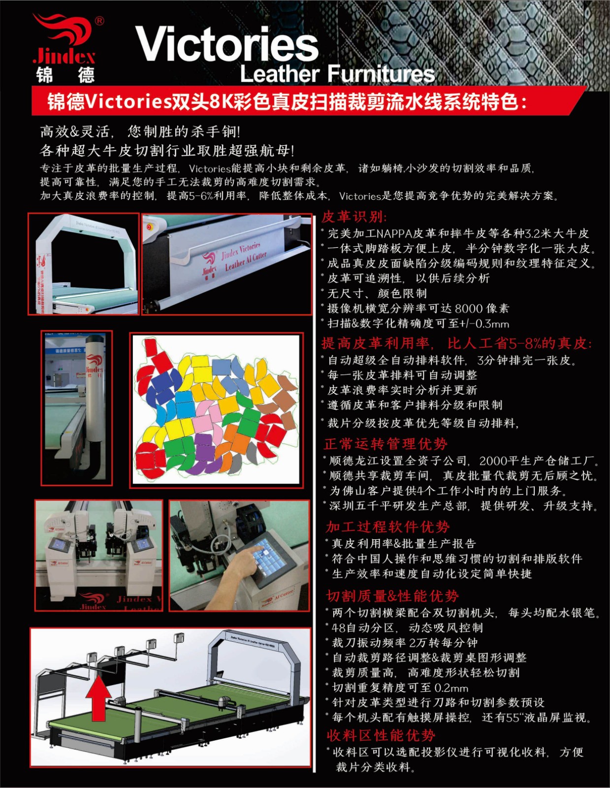 錦德真皮裁剪流水線系統(tǒng)采用先進(jìn)的高清全彩真皮輪廓采集系統(tǒng),通過高精度掃描提取真皮不規(guī)則輪廓形狀、面積、瑕疵等信息,配合全自動排料系統(tǒng),產(chǎn)生優(yōu)化的裁剪方案,獨(dú)特的三段式流水工作平臺,可以發(fā)揮最大裁剪效能,減少勞動強(qiáng)度,提升綜合使用能效,裁剪效能較傳統(tǒng)真皮裁剪設(shè)備提升120%以上。